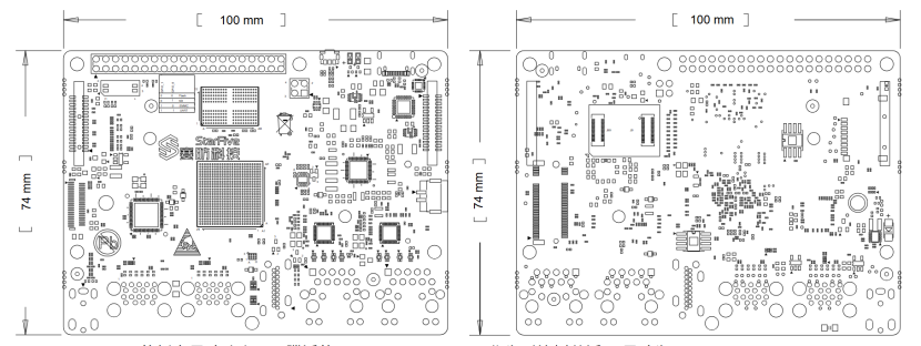 100mm x 74mm 的板卡尺寸略小于飞腾派的 119mm x 93.1mm,作为对比树莓派4B尺寸为85mm x 56mm