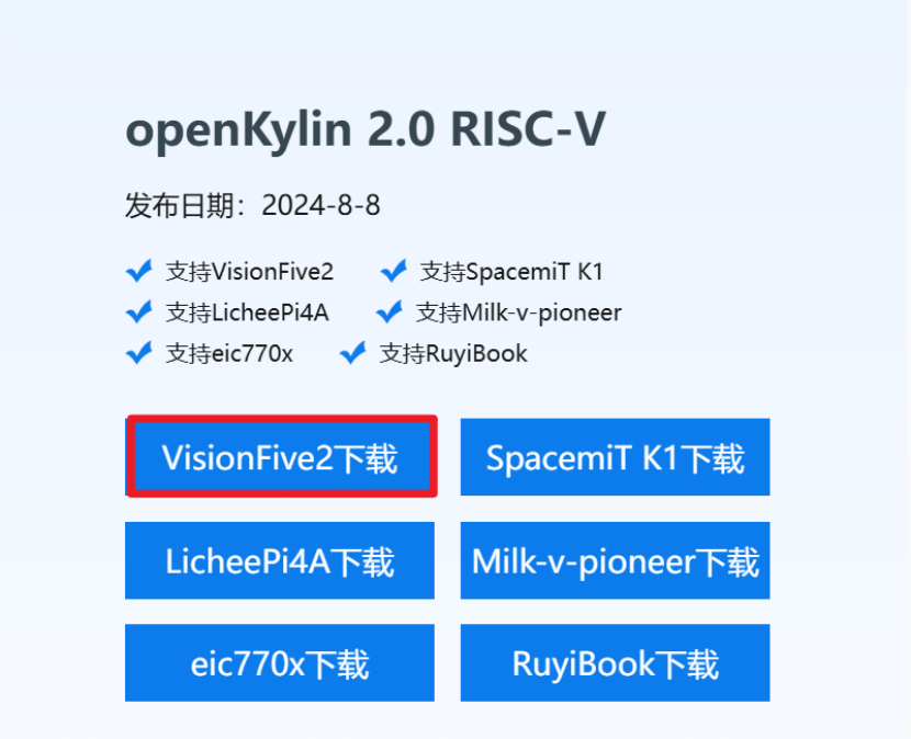 openKylin镜像:https://mirrors.hust.edu.cn/openkylin-cdimage/2.0/openKylin-Embedded-V2.0-Release-visionfive2-riscv64.img.xz