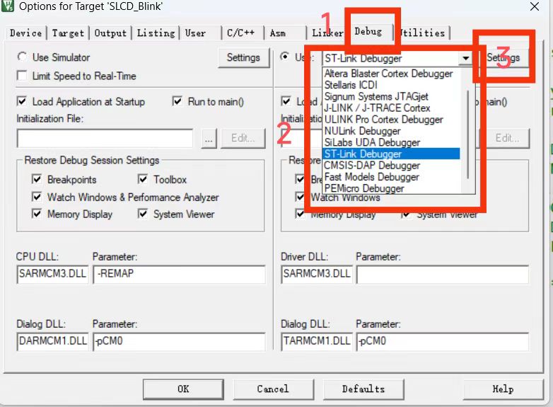2、点击debug,选择STlink进行烧录,再选择setting
