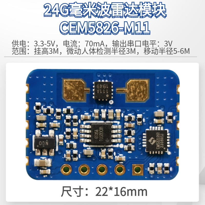 CEM5826-M11 是一款高灵敏度 24GHz 毫米波人体微动存在检测雷达模块。区别于传统 雷达通过检测人体移动的大幅度动作或肢体动作来判断人体存在,本模块主要特点是在传统人 体感应雷达的功能基础上,同时具备检测积累人体微动幅度的运动,来判断人体的存在的功 能。因此相比传统多普勒雷达来说,具备一定范围内的存在检测,准确率更高。不易漏报。商城仅售9.9包邮!