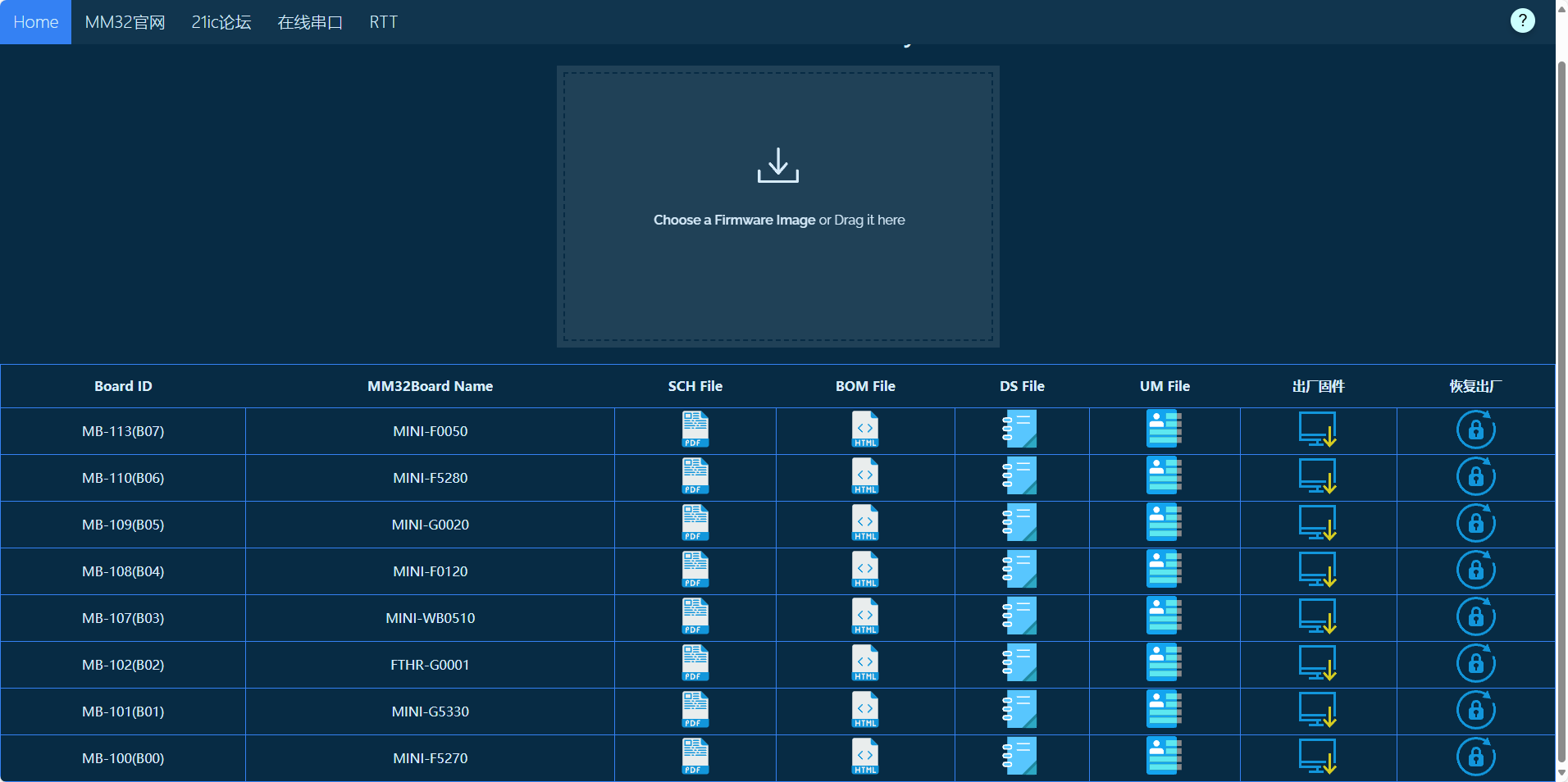 在这个网页中,我们可以对MM32系列的板子(大部分都支持),进行出厂恢复,特别是还可以在这个页面中,下载我们需要的资料:包括SCH File、BOM File、DS File、UM File等等。
