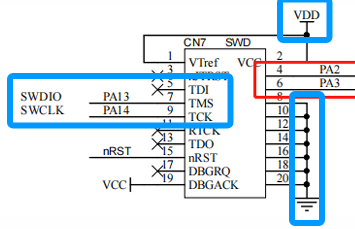 注意:如果用的是ST-Link,根据原理图在SWD中的接线方式如下图所示: