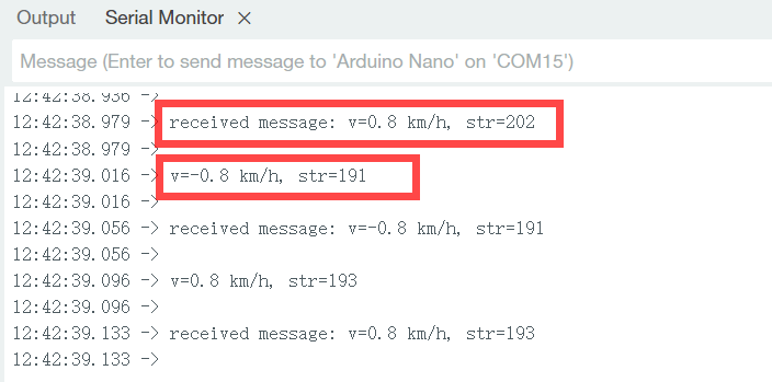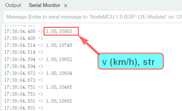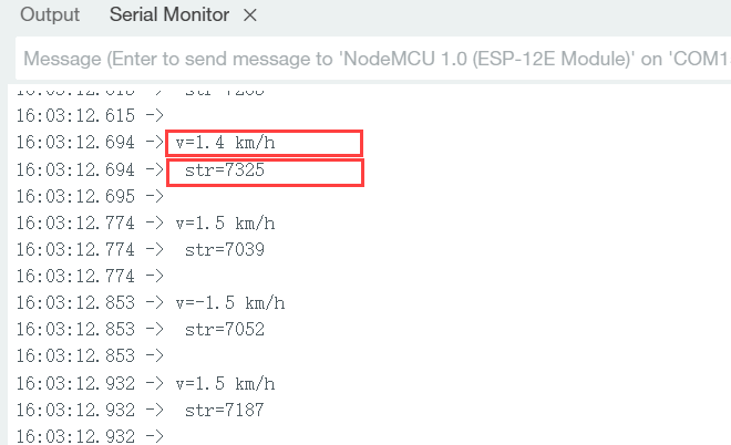 当采用串口输出模式时,雷达检测到运动时,则输出 v=0.0km/h, str=1234 字样;