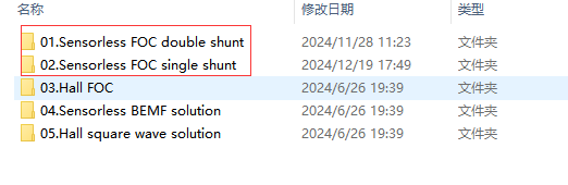 编译和烧录的例子, 我选择 01.Sensorless FOC double shunt, 应该原板出厂就自带这个固件.