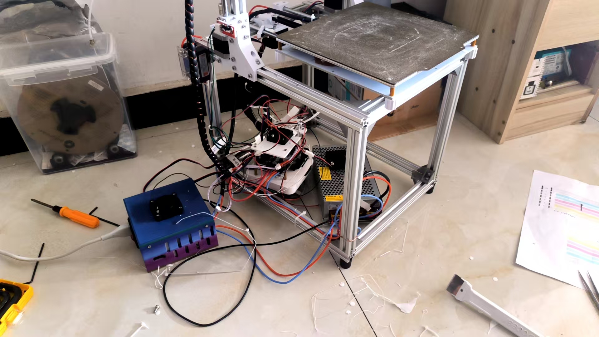我的打印机是一台diy的i3结构的打印机,它的热床在我装配的时候干弯了(交流热床,没有钻头买了一张直流开好沉孔的热床盖上,孔径没对好,弯了)我们欣赏它的遗容遗表吧: