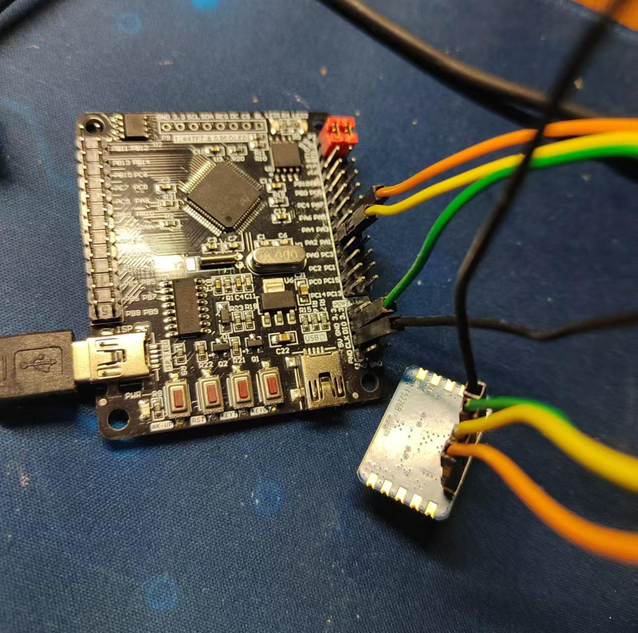类似于上一篇介绍的如何通过电脑来读取雷达模块发送的信息,与单片机连接同样需要连接四根线,分别是5V→5V,GND→GND,RXD→PA2,TXD→PA3;可见,电源部分对应相接即可,信号线部分,雷达模块的发送连接单片机的接收,雷达模块的接收连接单片机的发送,由于主要使用的是雷达模块发出的信息,雷达模块的发送不接线也可以。