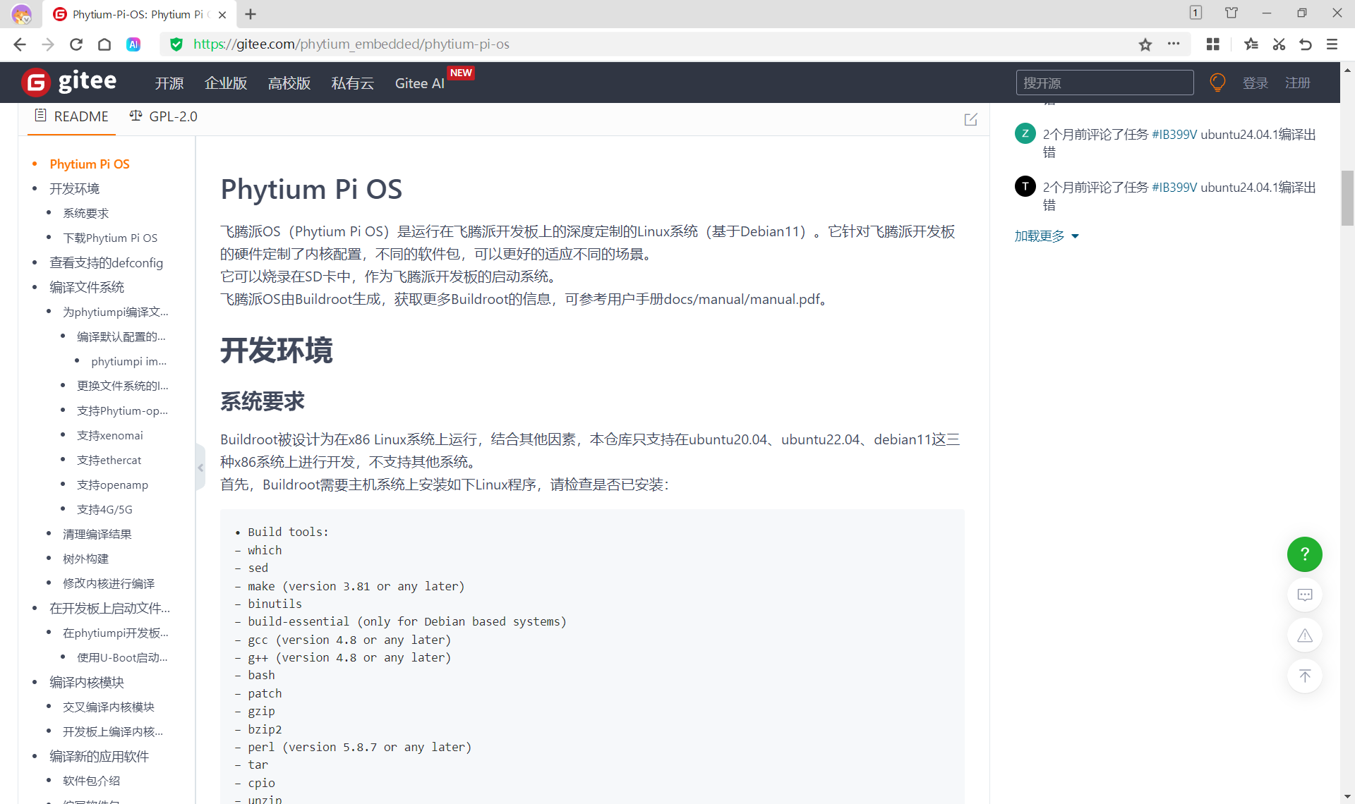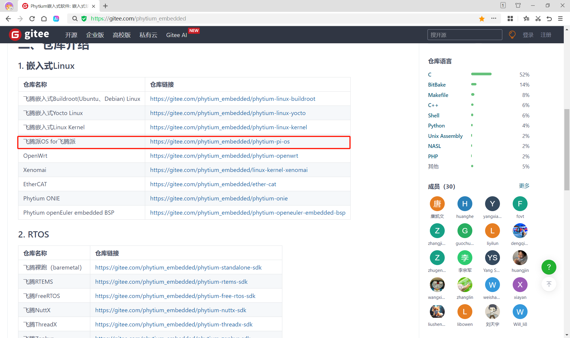 点击飞腾派OS for 飞腾派后面的那个链接,就进入到phytium-pi-os代码仓页面了,如下图:
