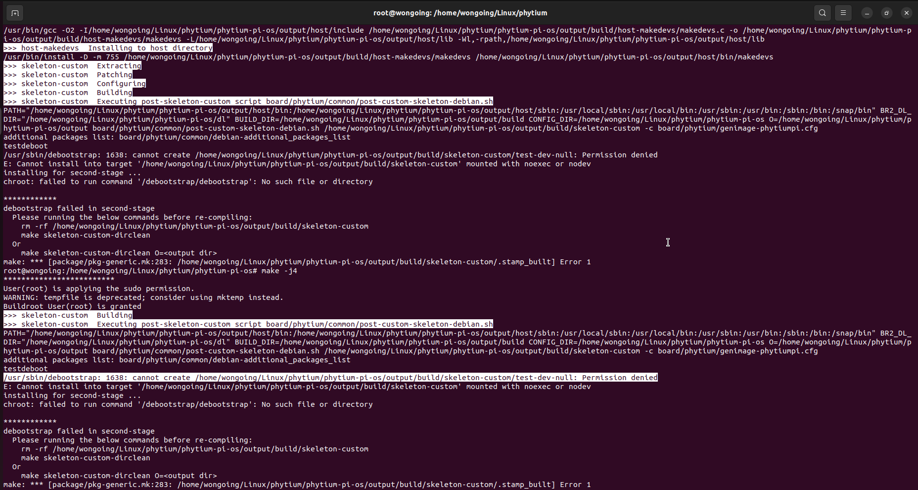 可以看到在代码仓的README部分可以看到搭建Phytium Pi OS的编译环境步骤(我用的是Ubuntu22.04)及系统源码编译步骤。我按找这个步骤指定到make系统编译时报了:/usr/sbin/debootstrap: 1638: cannot create xxxx/test-dev-null: Permission denied错误,导致系统无法继续编译,如下图: