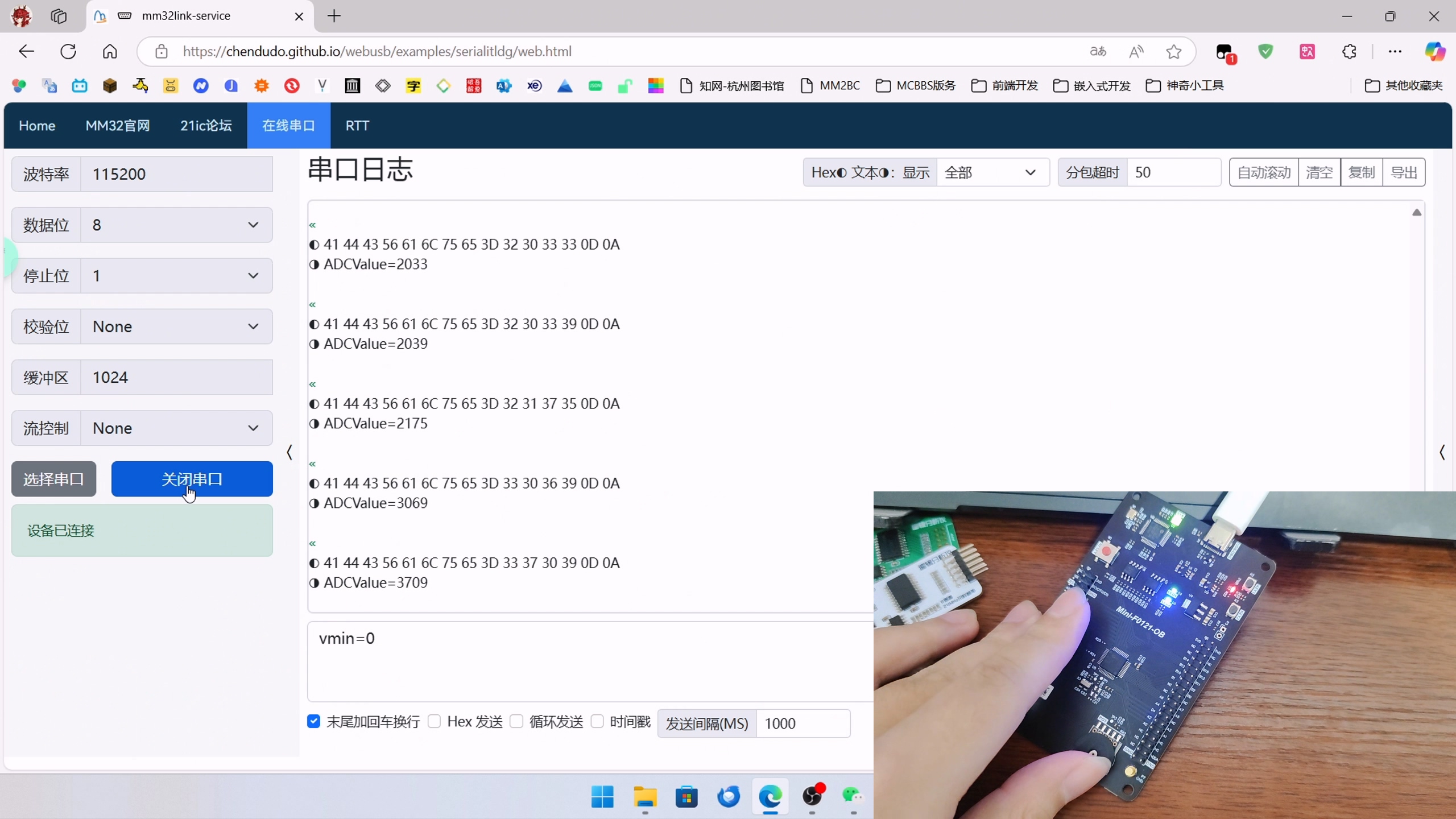 将开发板使用 USB 连接到电脑,打开在线串口即可接收串口调试信息。按下开发板上的K1或K2即可开始 ADC 采样,采样到的数据将实时发送到电脑;再次按下K1或K2即可停止采样
