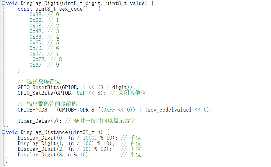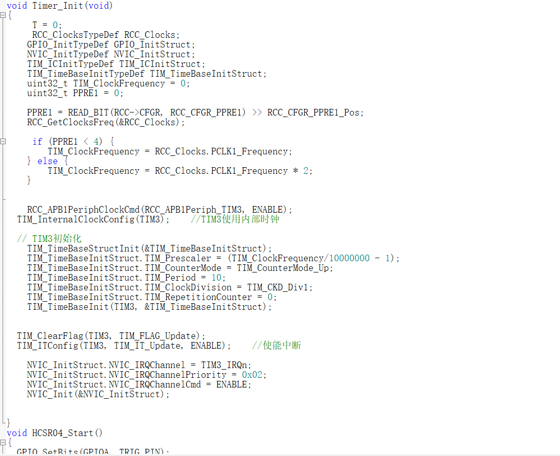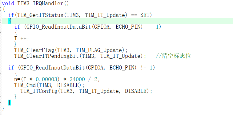这里我利用定时器中断功能将定时器计时频率设置为10Mhz,定时器重装载值设置为10,那么定时器每1us会产生一次中断。再跳转到中断函数中定时器每产生一次中断T++那相当于T值就是ECHO引脚高电平的时间最后再通过换算即可得到实际距离。