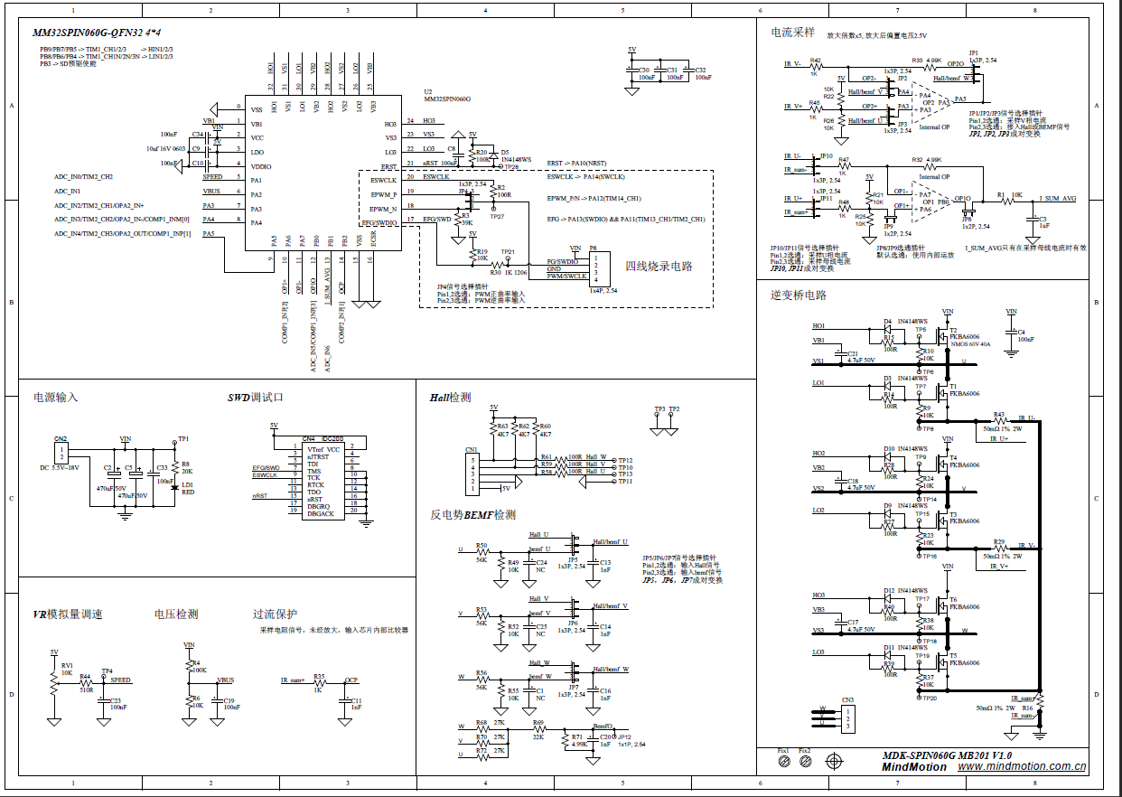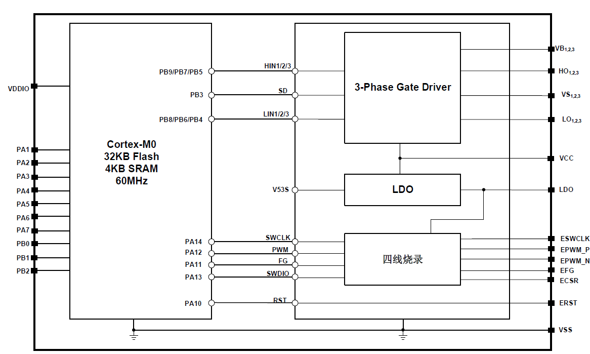 从官网资料可以得知芯片内部集成m0的MM32SPIN0230微处理器和驱动电机所需的三相栅极驱动器,采样运算放大器,比较器等。集成度非常高只需要少数外部元器件即可实现完整的无刷电机驱动方案。
