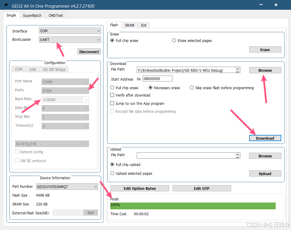 打开下载的串口烧录工具GD32 All In One Programmer ,根据图示,设置相关参数