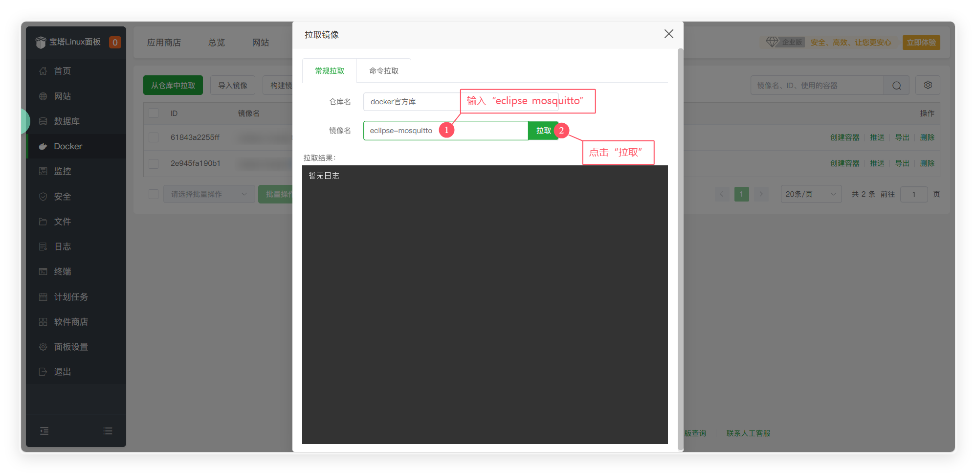1. 进入宝塔面板的 Docker 镜像管理界面拉取 Eclipse Mosquitto 镜像