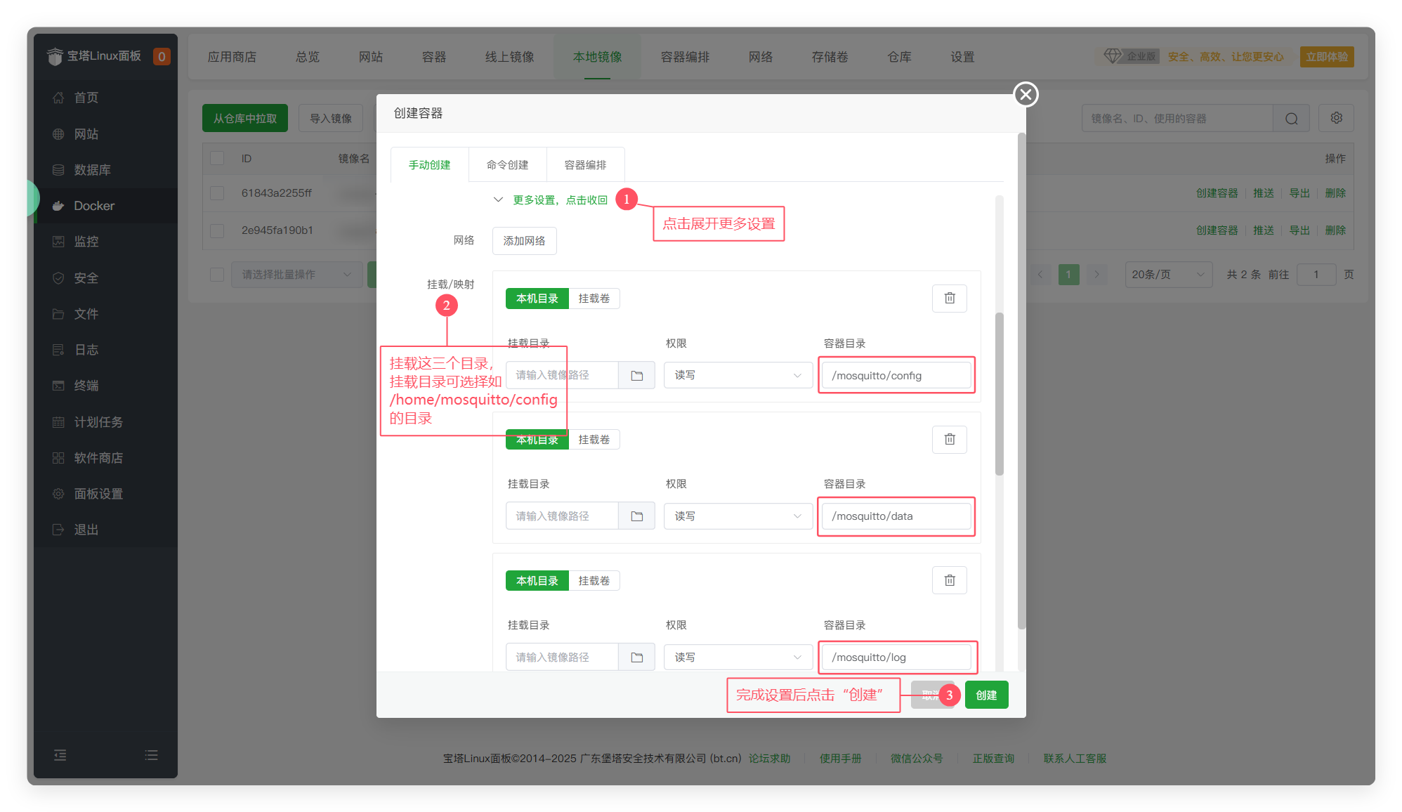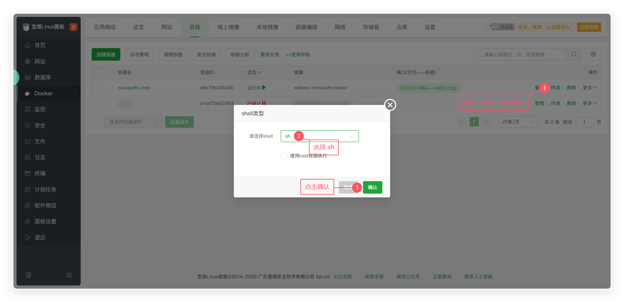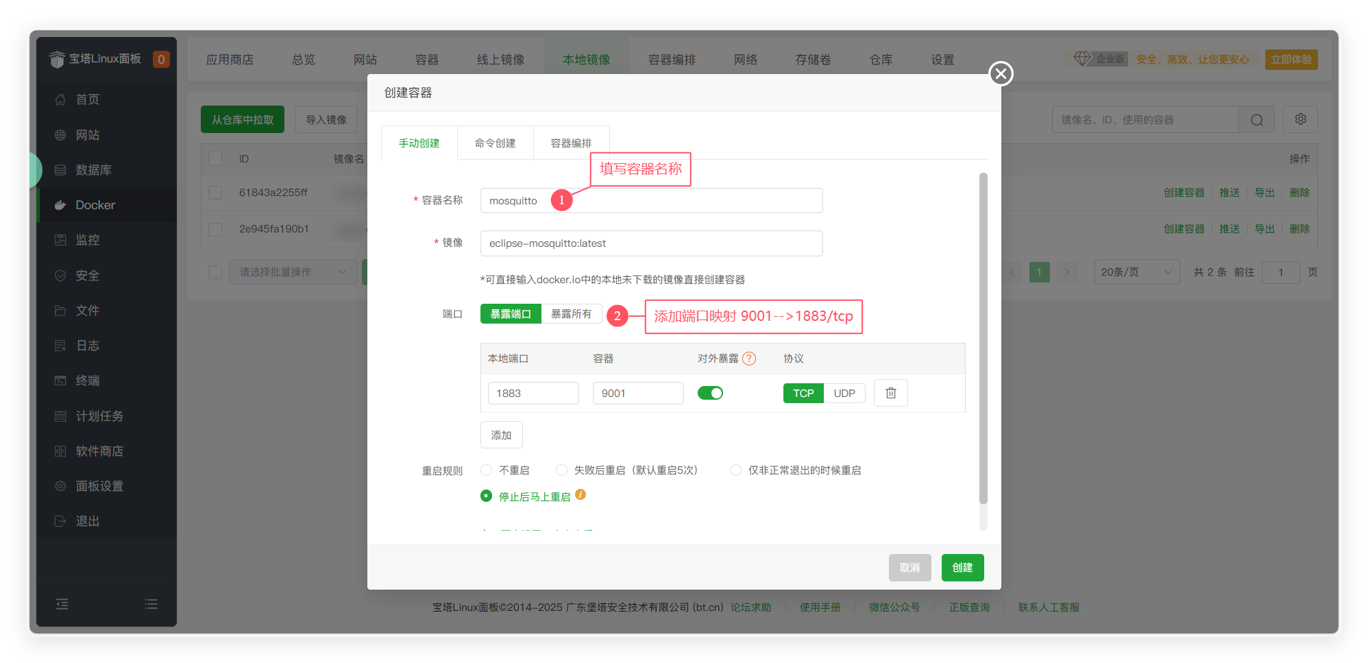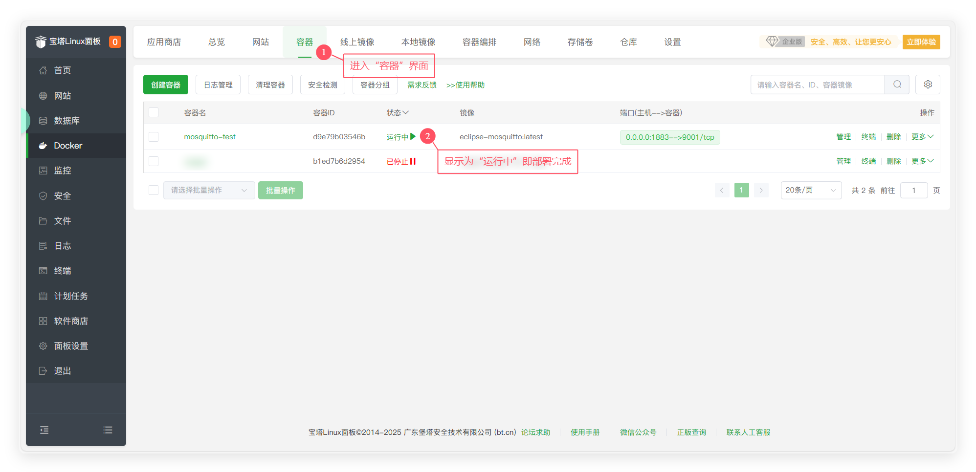 推荐使用容器技术进行快速部署,同时可以保证环境的一致性;下文是使用安装了宝塔面板的 Linux 服务器部署 Mosquitto 的步骤,你可以直接在你的本地设备安装 Docker 来部署 Mosquitto