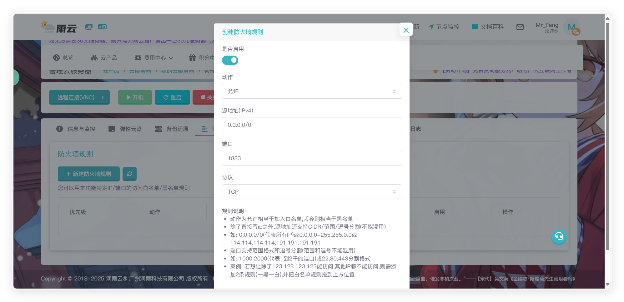 3. 前往服务器防火墙控制台,放行 TCP 端口 1883