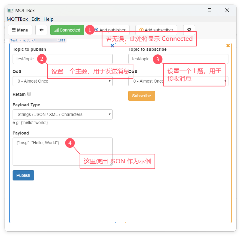 在 MQTTBox 点击“Subscribe”订阅主题 test/topic