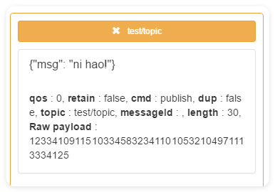 ,在终端输入 mosquitto_pub -t 'test/topic' -m '{"msg": "ni hao!"}'