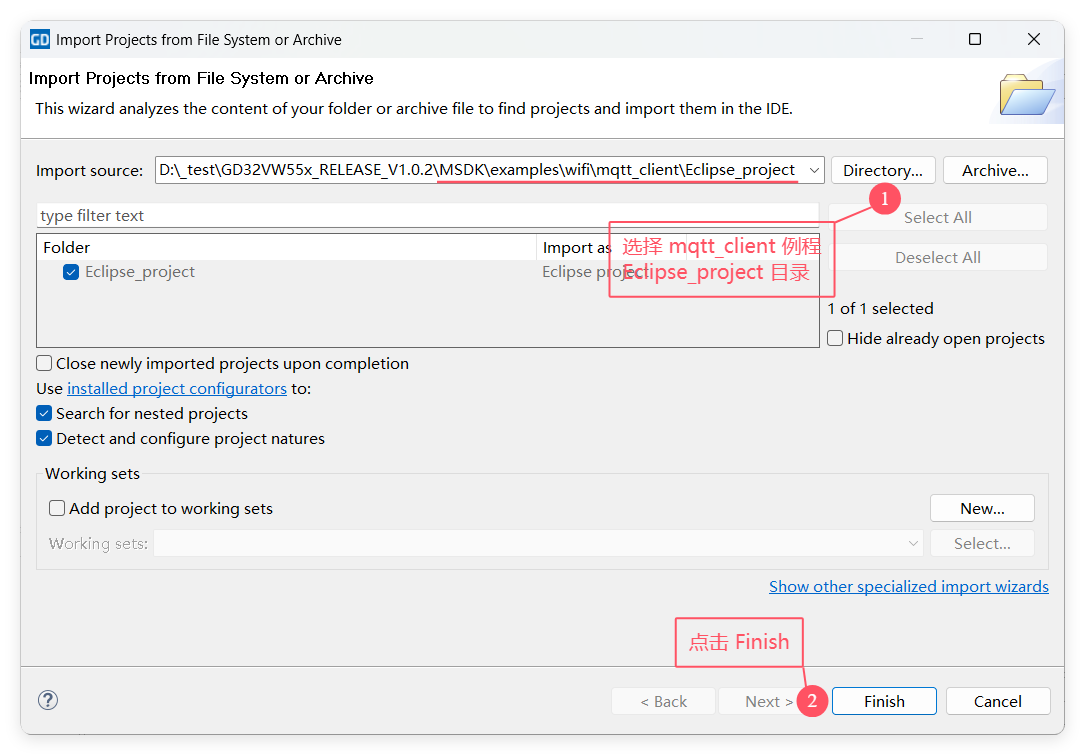 - 点击菜单栏 File > Open Projects from file System 导入项目,选择