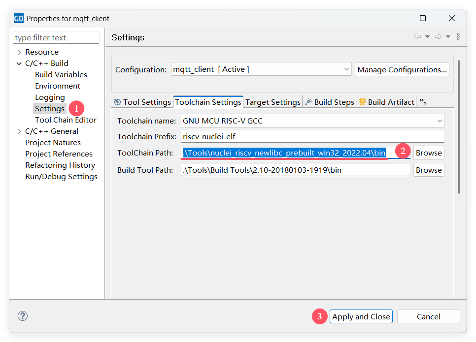 - 右键导入的项目,选择 Properties,进入 C/C++ Build > Settings 中的 Toolchain Settings 设置 ToolChain Path 为刚刚解压那个文件中的 bin 目录