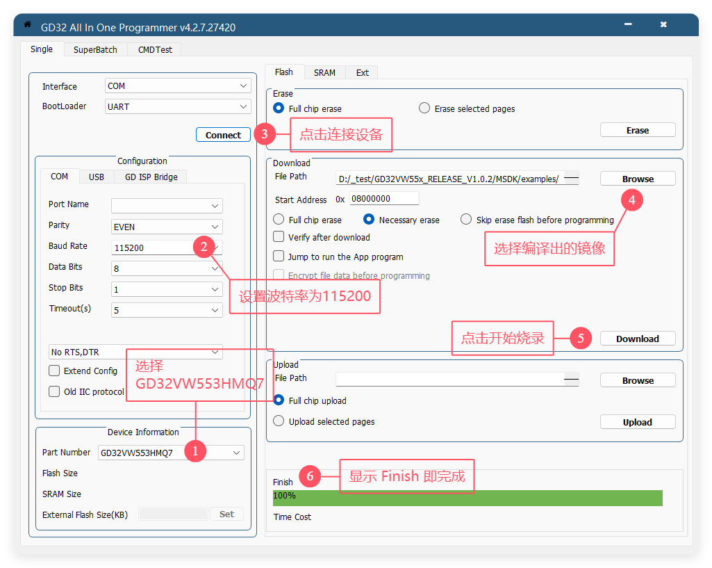 按照接线图连接电路(此处使用的是 CH341A 下载器,其他同理),连接完成后进入 BOOT0,使用 GD32 All In One Programmer 软件烧录