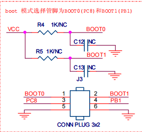 实物上的BOOT0、BOOT1的上拉电阻都没焊接,所以使用板子上的排针跳线帽去接是没用的。