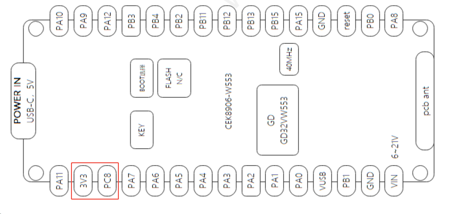 但是板子有一个很巧妙的设计,BOOT0是和PC8接在一起,并且和3V3是紧挨着的,所以我们只需将BOOT0的跳线帽拔掉,然后用镊子短接PC8和3V3即可(这种操作感觉比用跳线帽配置更简单)