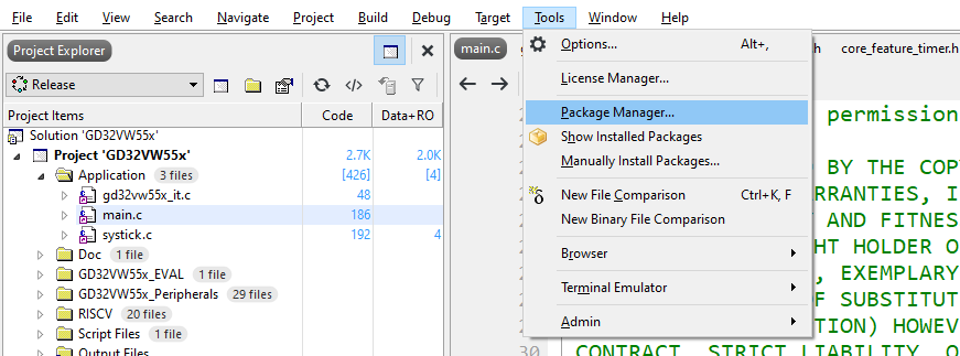 依次点击软件上方菜单栏 tools -> Package manager,在打开的新窗口中下滑找到 GigaDevice (或在左上角搜索框搜索“GD32VW55x”),找到最后一行,点击右侧“Not Installed”,之后开始下载,完成后会显示绿色“Installed”。