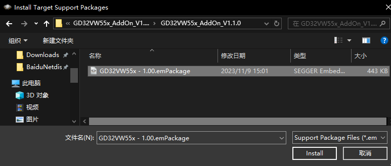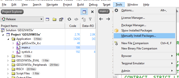 如果由于网络原因无法下载安装,击此处点下载组件包,离线安装,解压文件后,确保文件夹内存在 “GD32VW55x - 1.00.emPackage”文件,回到Segger Embeded Studio,依次点击窗口顶部菜单栏 tools -> Manually Install Package,在弹出的窗口中选择“GD32VW55x - 1.00.emPackage”文件,