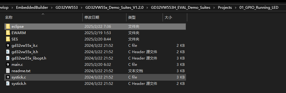 下载并解压上文的GD32VW55x_Demo_Suites,依次点击 GD32VW55x_Demo_Suites_V1.2.0 -> GD32VW553H_EVAL_Demo_Suites -> Projects -> 01_GPIO_Runing_LED