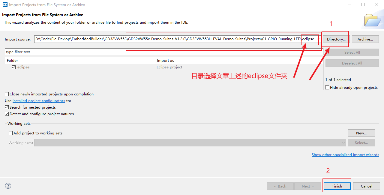 打开GD Embeded Builder,在顶部菜单栏依次点击 file -> Open Projects from File System... ,在弹出的新窗口中点击 Directory... 选择上述的eclipse文件夹后点击 finish (如下图所示)