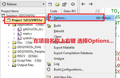 修改输出格式后,即可进行编译,在左侧项目名上右键选择 Build,或点击窗口上方菜单栏中 Build -> GD32VW55x,或点击编辑器右上角如下图标,或直接按键盘上F7