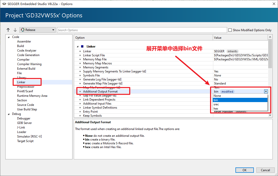 项目没有配置默认的程序编译输出文件格式,需要手动指定,指定方式为:在左侧项目名上右键选择 Options... -> Linker -> Additional Output Format,将输出格式选择为bin,点击下方 OK 即可