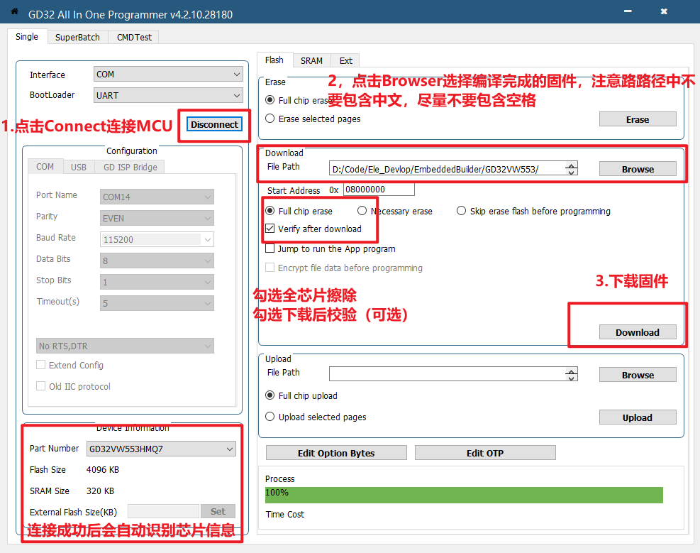 当下方进度条为100%时,点击Disconnect,断开TTL模块与开发板的连线,将Boot0跳线帽复位,