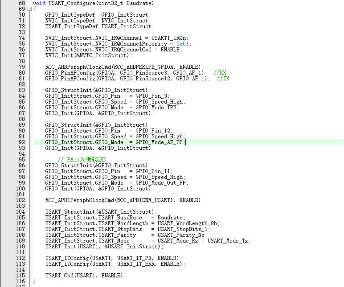 将串口配置到PA3和PA12引脚上,并且配置PA11引脚为输出