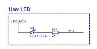 通过查阅开发板的原理图可知,PA11连接到用户LED上,且负极接引脚。