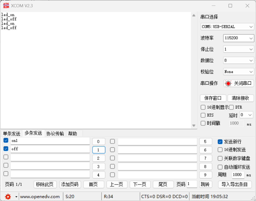 打开串口调试助手,连接开发板,当发送“on1”时,板载的LED点亮;当发送“off”时,LED熄灭。