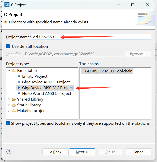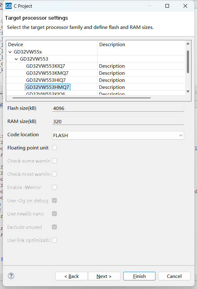 选择GD32VW553HMQ7芯片,可以直接finish完成,也可以去下一步看看,下一步的设置保持默认即可