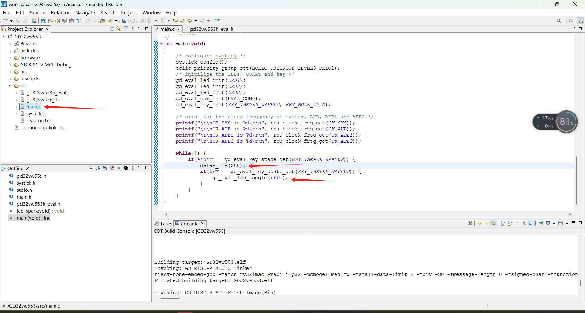 找到gd_eval_led_toggle(LED1);这一行代码 改为gd_eval_led_toggle(LED3);