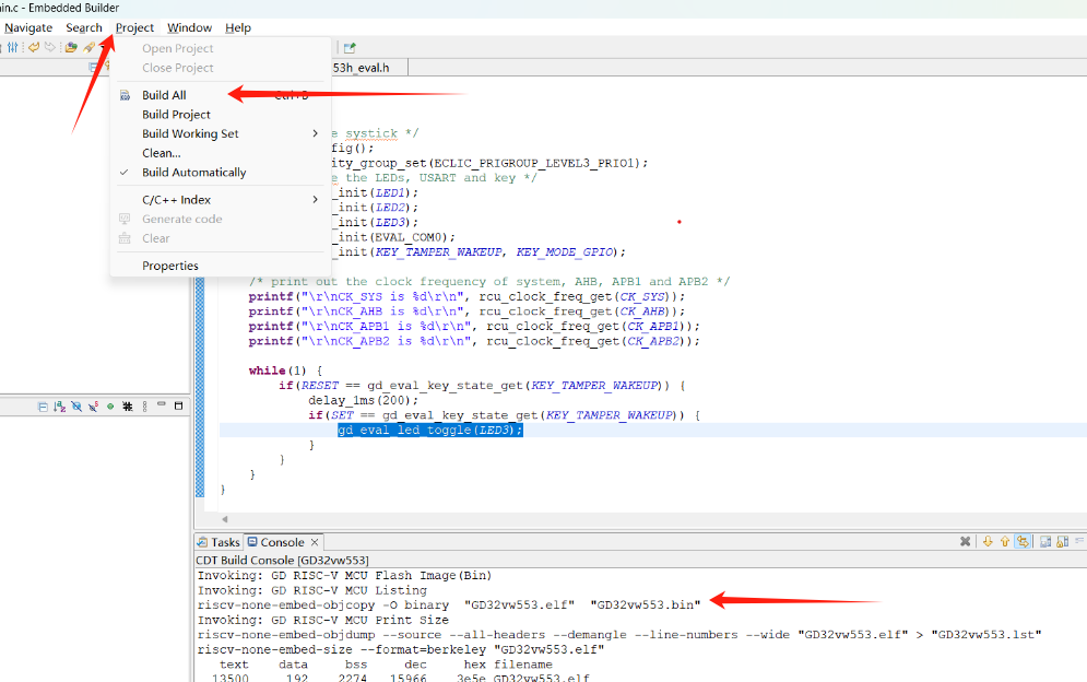 然后点击project -> Build All编译项目,项目编译完成会看到有个.bin文件生成,在项目目录下可以找到该文件