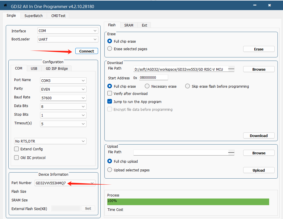 在上传软件中选择对应的串口和芯片型号然后点击Connect连接单片机,如果连接成功,左下角芯片型号下面会显示出flash和ram信息,如果连接失败请检查接线是否对,线材是否通常,烧录器是否可以正常工作。
