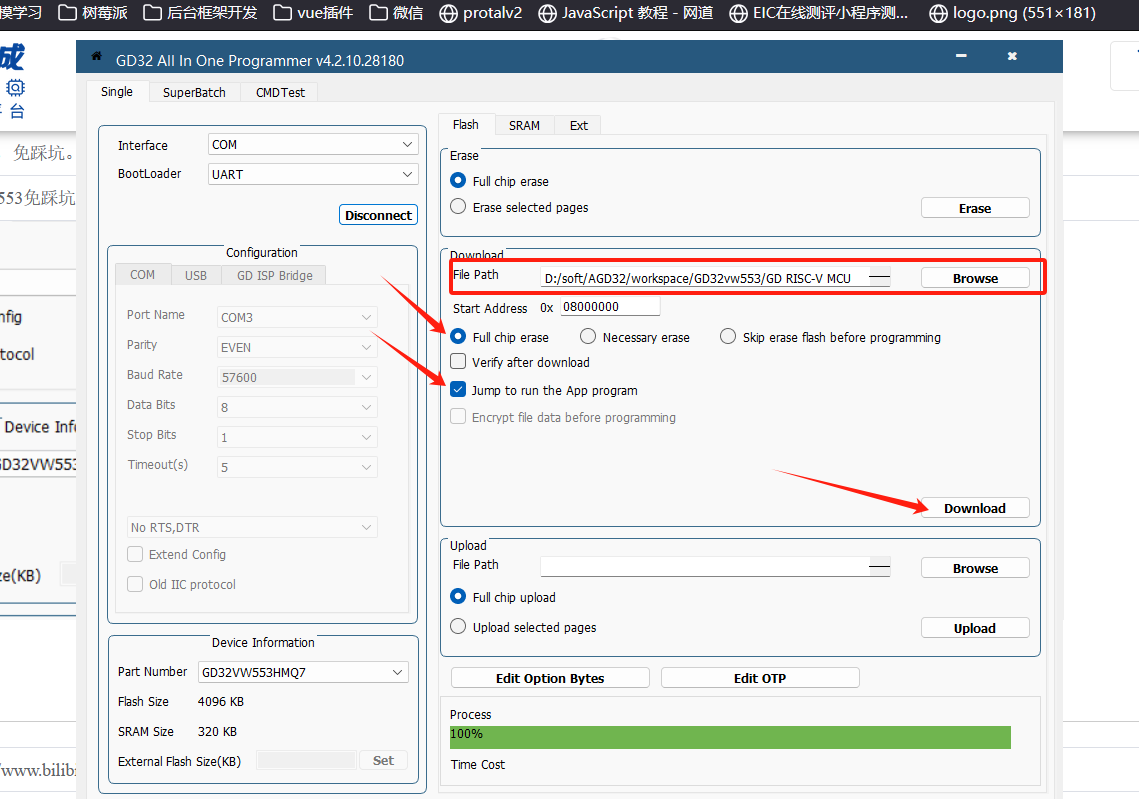 然后选择刚才在项目里编译好的.bin文件,如图所示选择全片擦除后烧写和烧写完自动运行程序。
