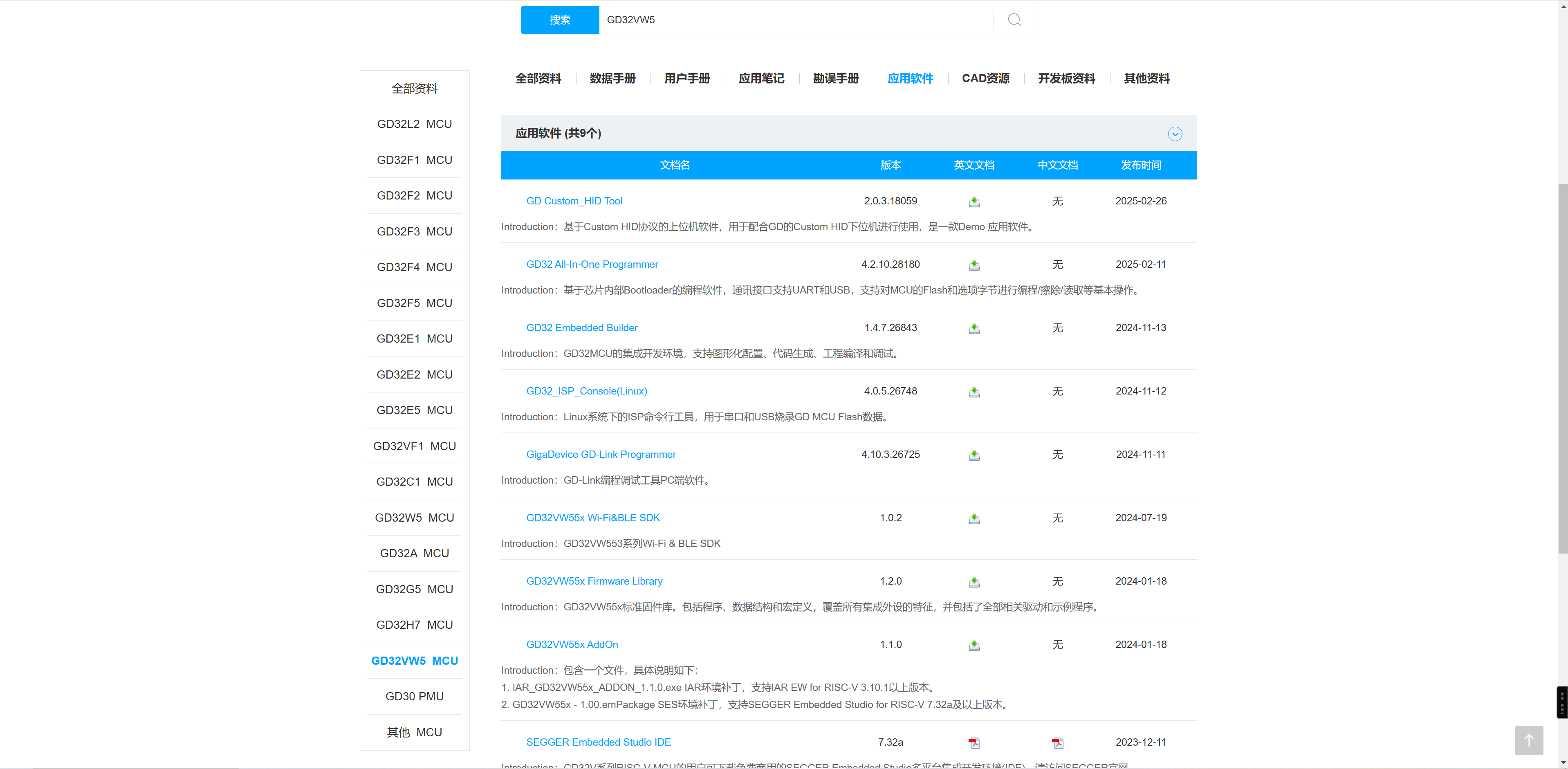 至于开发环境的搭建则需要我们访问GD32官方网站, 在这个页面里,用户可以根据自己需要的资料进行下载。