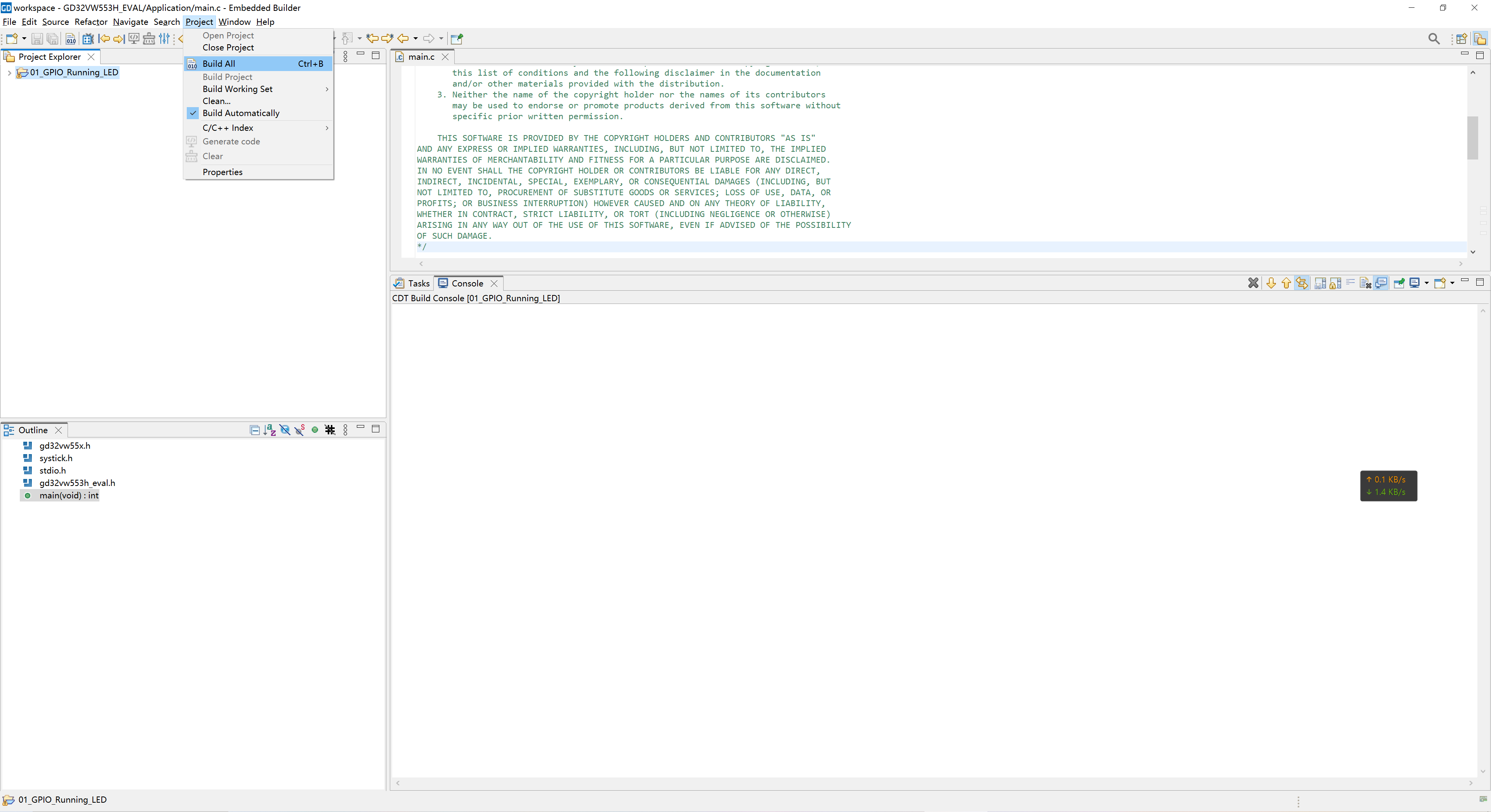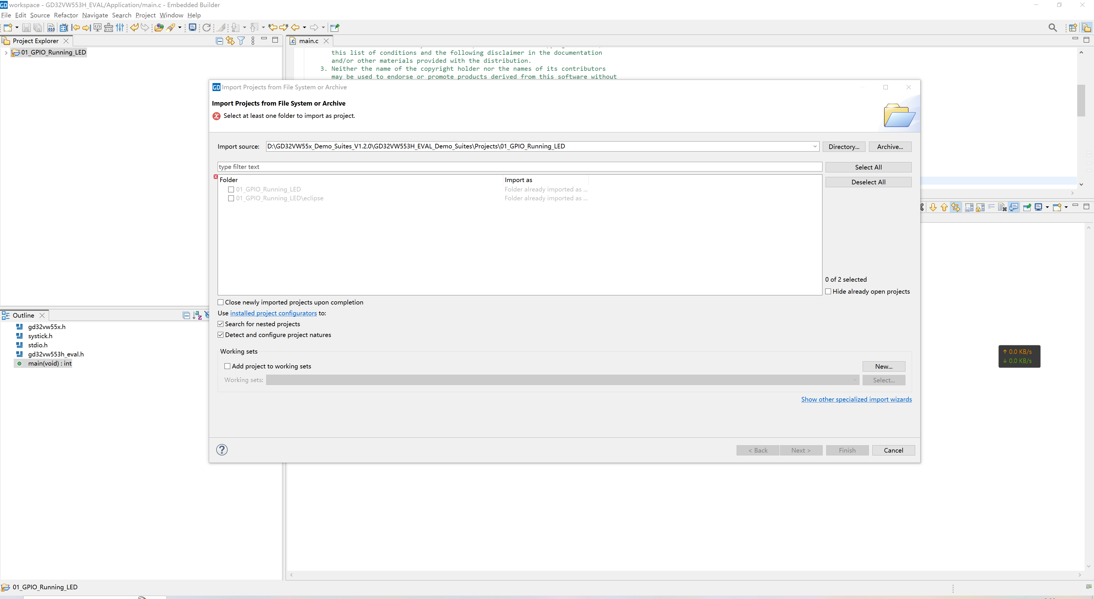 file->open project from file system ->directory 然后选中01_GPIO_Running_LED 的project。