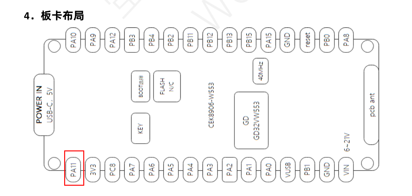 之后我们使用万用表来测试PA11端口, 引脚位置如下所示