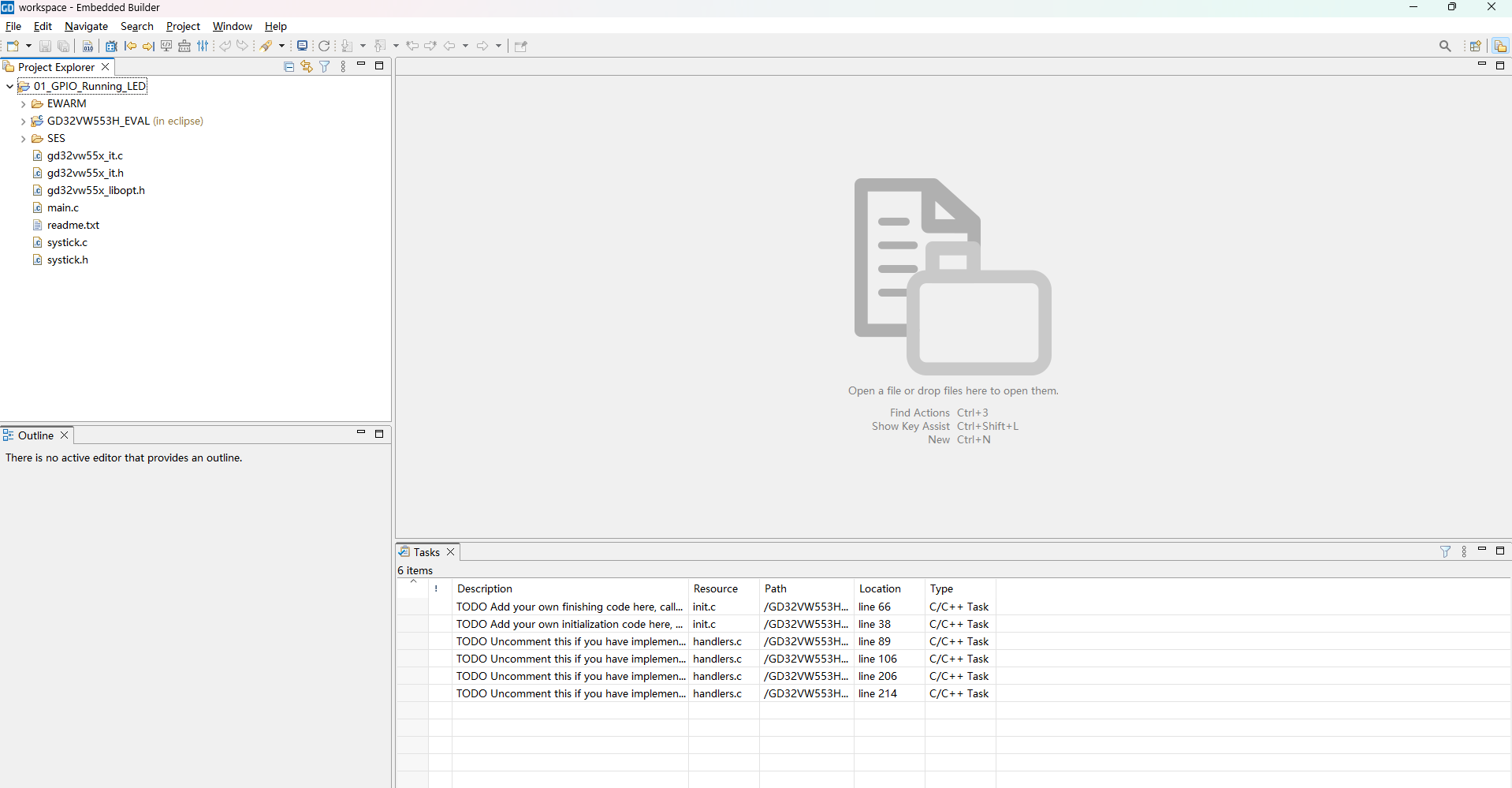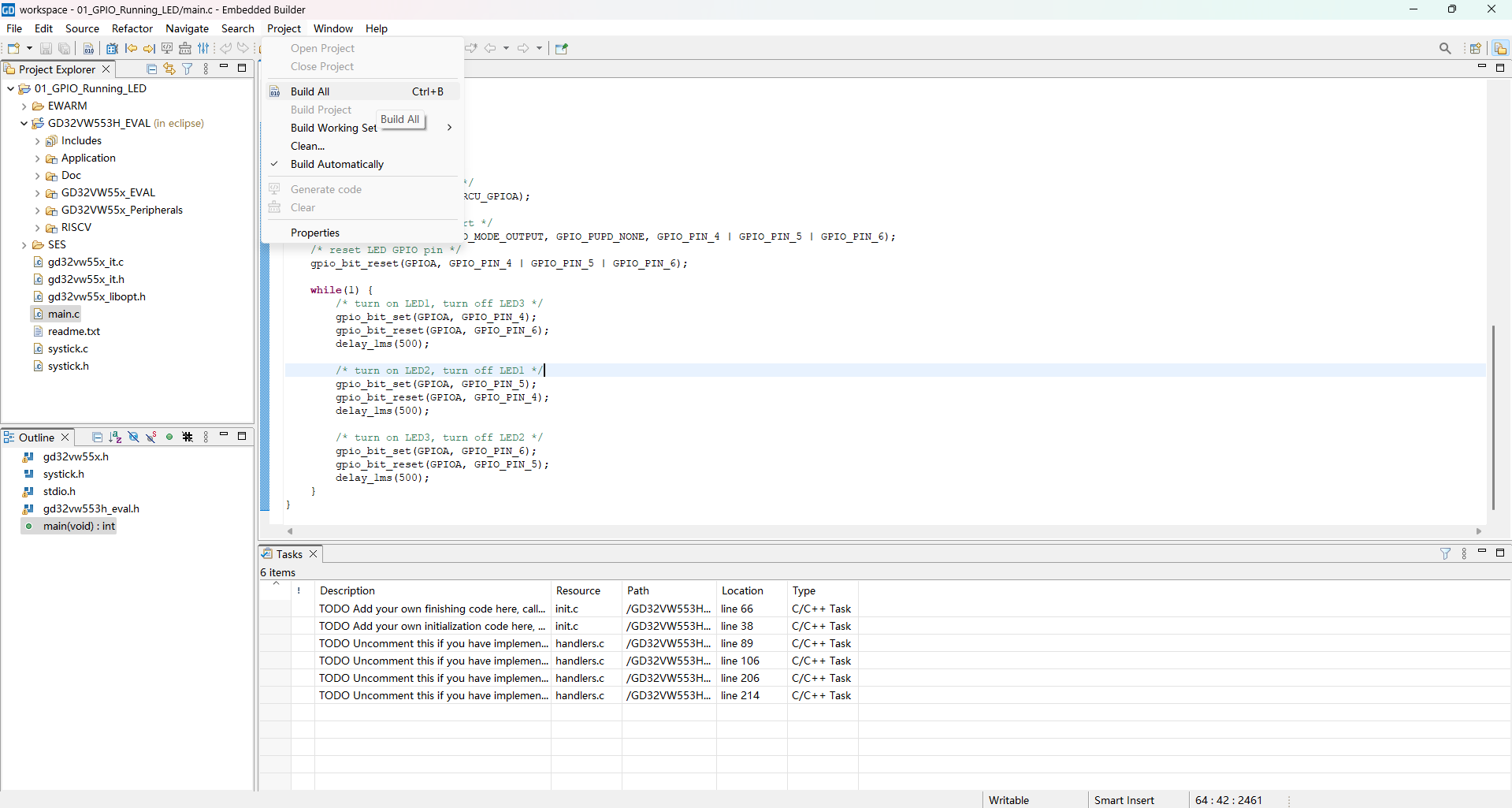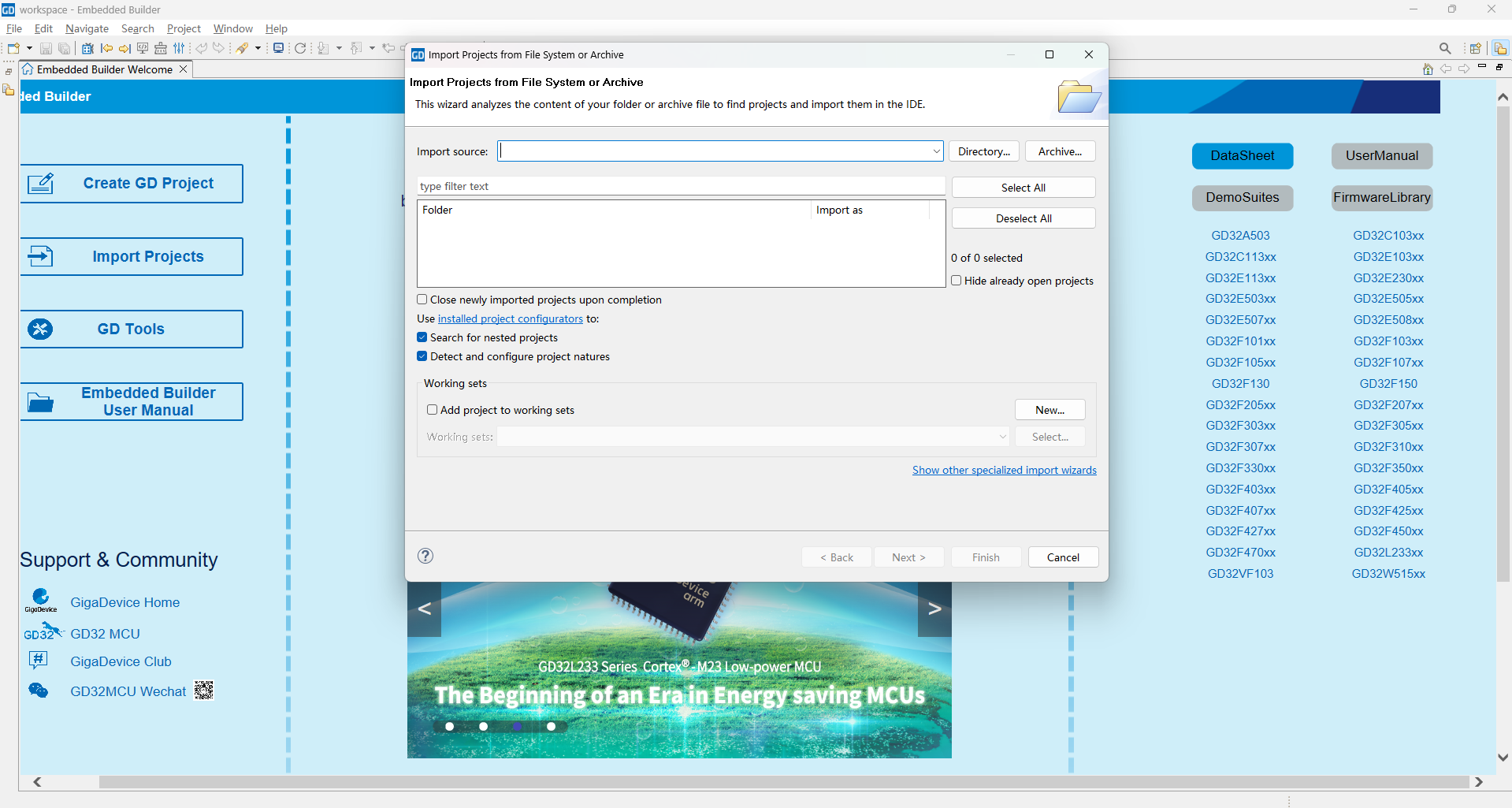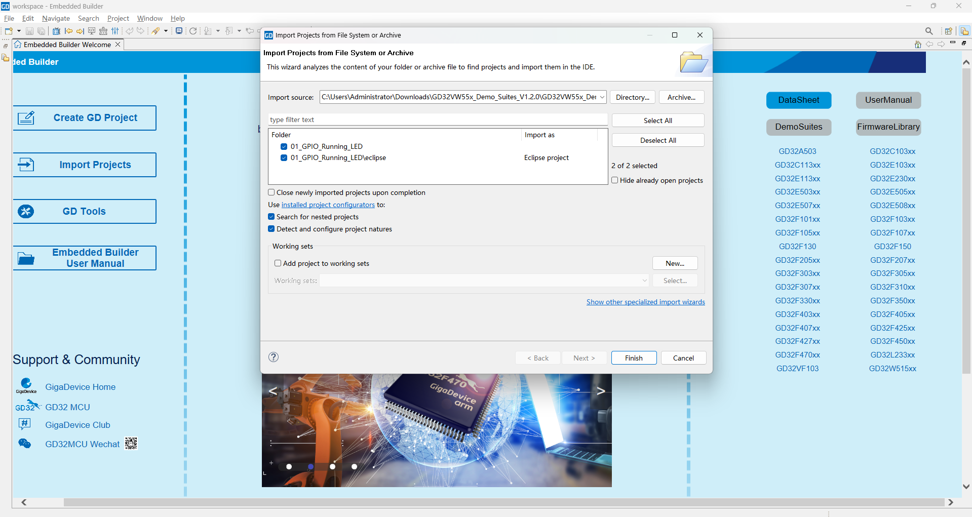 2、点击左侧import projects,选择GD32VW55x_Demo_Suites官方的代码示例中的LED做测试验证