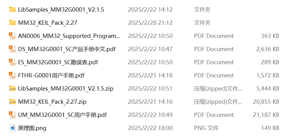 LibSamples_MM32G0001_V2.1.5这个文件夹里边是官方的例子程序,注意之后所有的运行程序都需要在该文件夹下编辑,否则会编译失败,因为这个文件夹下有相关的库文件。