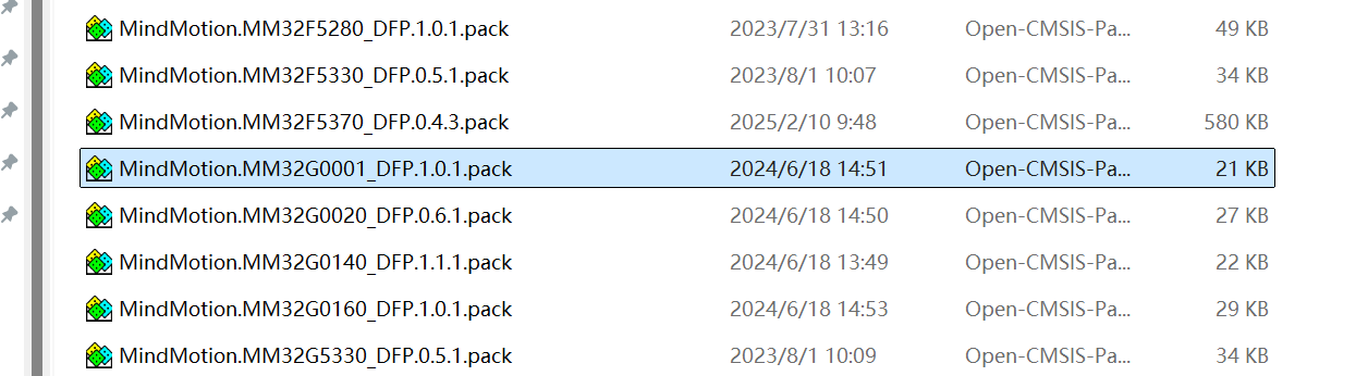 首先需要资料中的MM32_KEIL_Pack_2.27文件夹中的本开发板的keli加入到keli里边去,只需双击即可。MindMotion.MM32G0001_DFP.1.0.1对应keli包是这个。