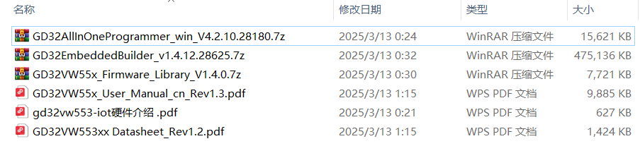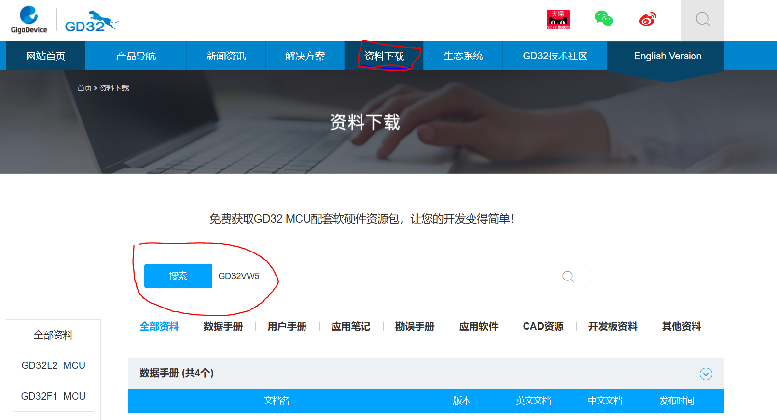我们可以去到gd32的官网,选择 资料下载,然后搜索 GD32VW5,便可以看到关于这款芯片的所有资料。