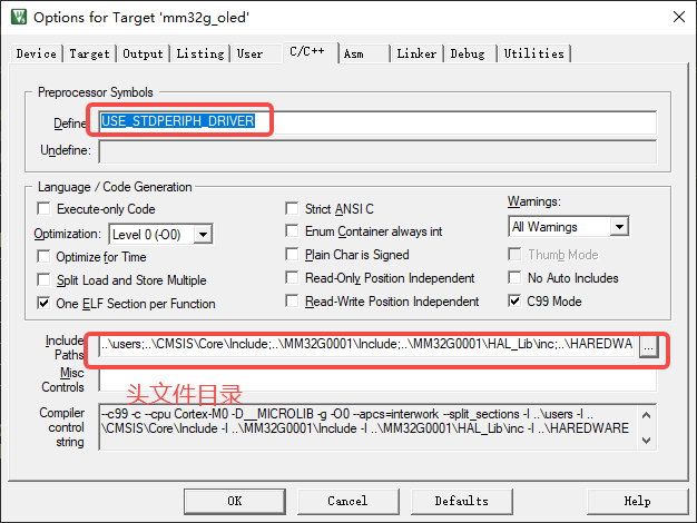 然后进入到这个界面把USE_STDPERIPH_DRIVER填进去,把头文件也添加进去
