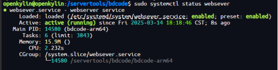 启动服务后,可以输入sudo systemctl status websever检查服务是否正常启动,如图所示则为正常启动